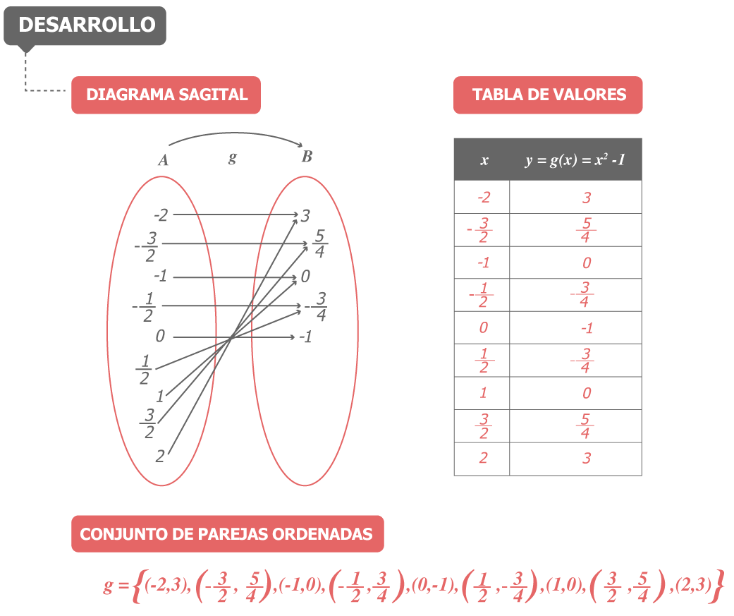 Con base en la correspondencia definida para g, realice un diagrama sagital, una tabla de valores y un conjunto de parejas