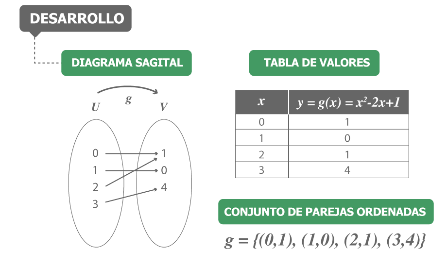 La función g así definida NO es inyectiva (uno a uno), porque para x1=0 y x2=2 (diferentes) NO se cumple que g(0) ≠ g(2) puesto que g(0) = g(-2) = 1 Por lo tanto, y a pesar de que g así definida es sobreyectiva, se dice que la función g es una función NO biyectiva; es decir, no se cumple que para todo y ∈ V existe un único elemento x ∈ U tal que la función evaluada en x es igual a y .